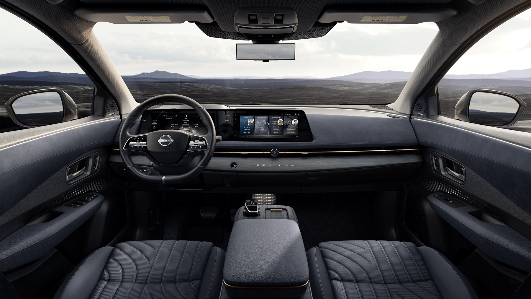 Please come in. The spa-like nature of the Nissan ARIYA welcomes you with a wide-open design, front and rear outboard Zero Gravity seats, generous 2nd-row legroom and a sliding center console that can reshape your sense of comfort. A serene ambience fills the cabin from a glowing lantern under the dash.