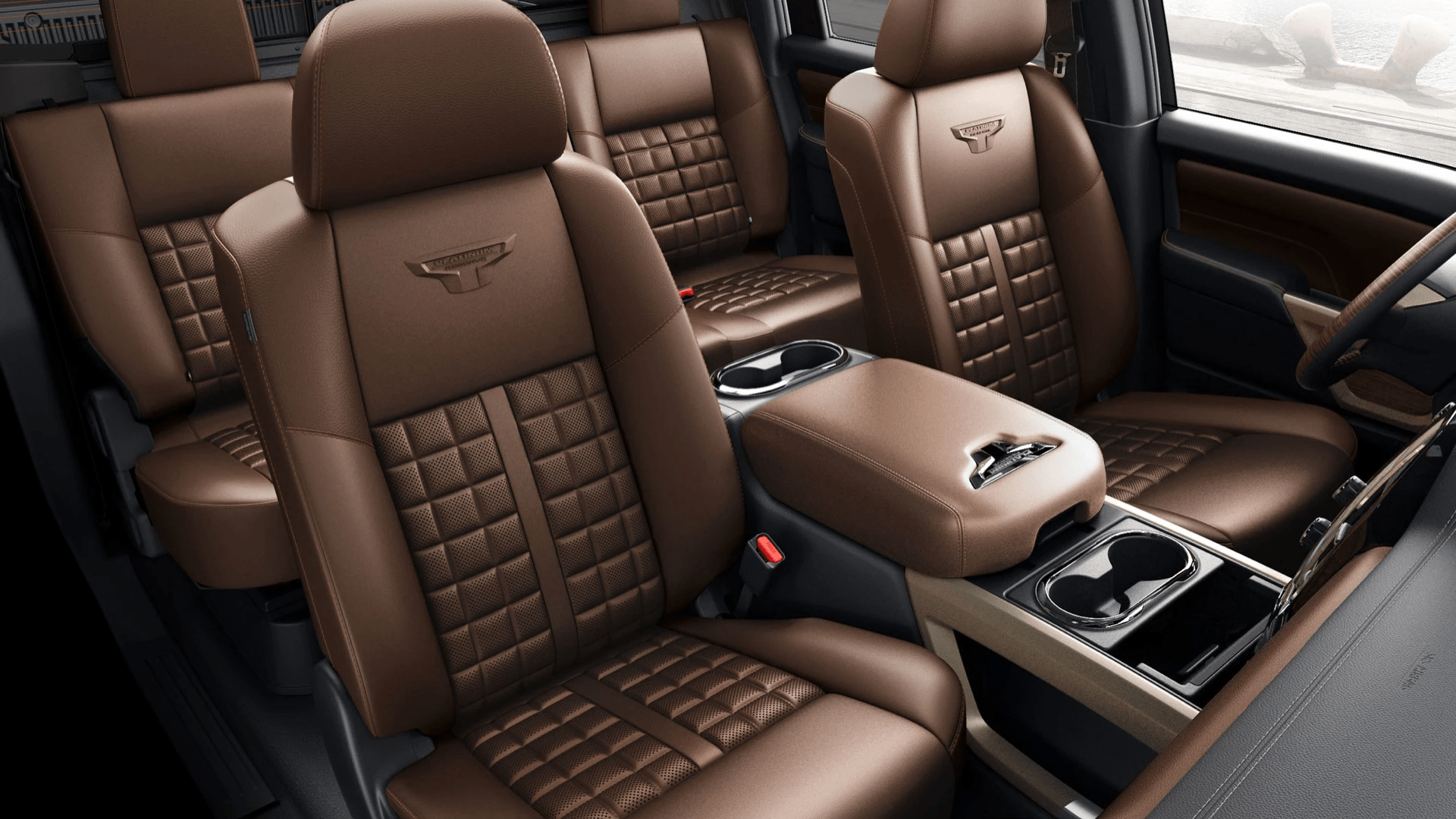 It’s easy to feel taken care of in the new TITAN and TITAN XD. There’s updated smartphone connectivity, a Fender® audio system, and even a Wi-Fi hotspot. There are also comforts like front and rear Zero Gravity seats and climate-controlled front seats, plus a clever holder for two smartphones, or even a tablet.18 And with the new Dual Panel Panoramic Moonroof, this truck just might spoil you rotten.