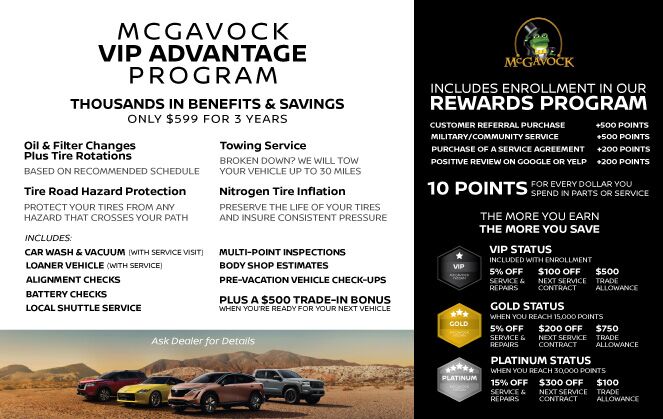 Join the VIP Advantage program for three years and enjoy thousands of dollars in benefits and savings for only $599. This includes oil & filter changes, tire rotations, towing service, tire road hazard protection, and nitrogen tire inflation. Additionally, you'll receive unlimited car wash & vacuum services with each service visit, loaner vehicles with service, multi-point inspections, pre-vacation inspections, and check-ups. On top of everything else, you'll get a $500 trade-in bonus when you're ready for your next vehicle!
